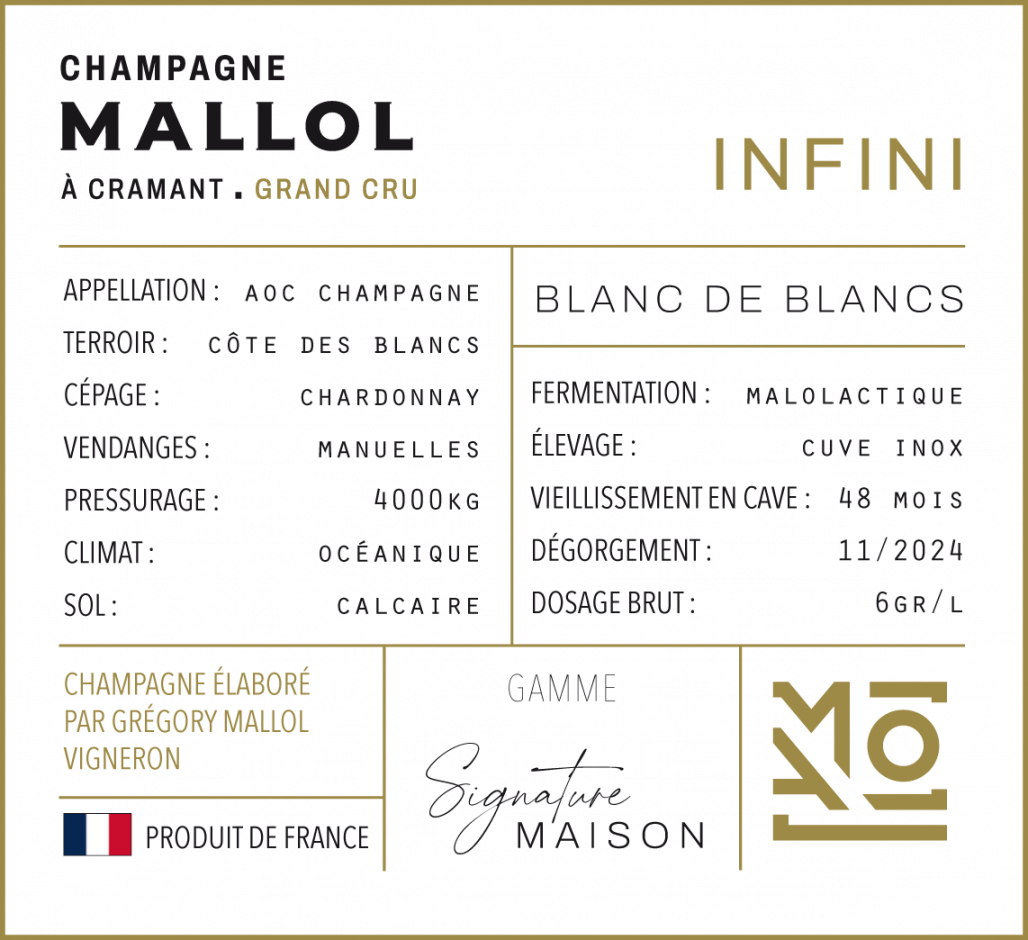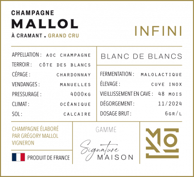 Dégustez dans notre gamme Signature MAISON “Infini“. Ce brut incarne avec élégance la maison Mallol située sur le prestigieux terroir de la Côte des Blancs. Vibrez avec la vivacité de ce chardonnay des Grands Crus, la délicatesse de ses bulles et l’envoûtant bouquet d’agrumes qu’il dégage.